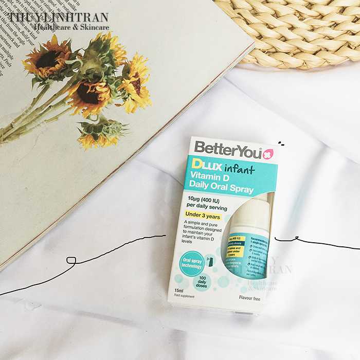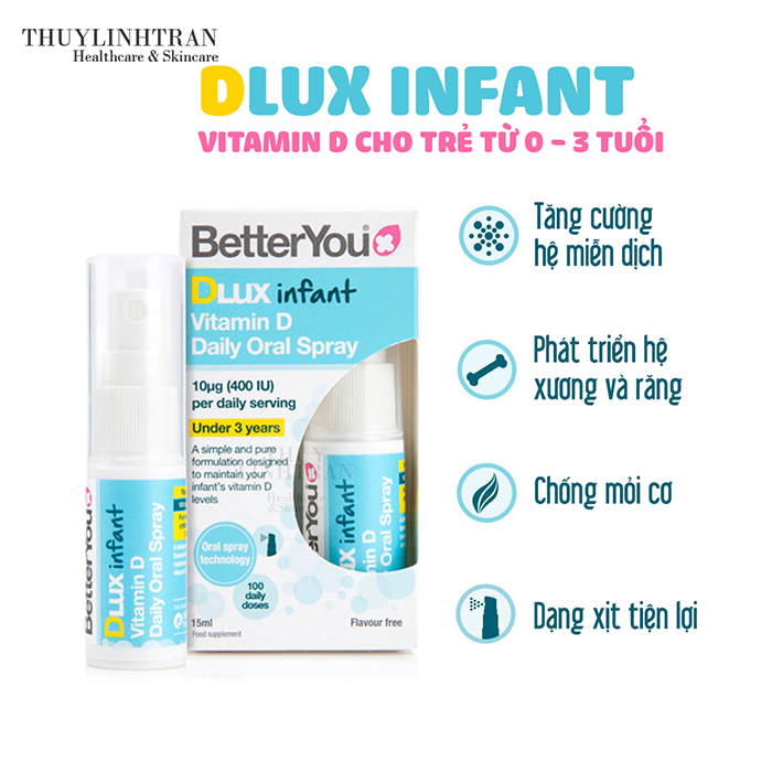 + Dlux Infant (màu xanh dương): mỗi xịt ~ 400IU vitamin D3, dùng cho trẻ sơ sinh đến dưới 3 tuổi.