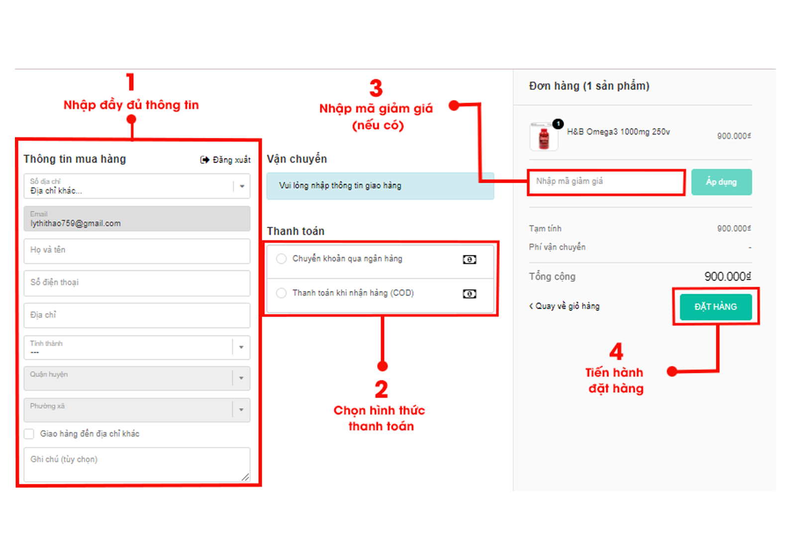 Bạn nhập đầy đủ thông tin người nhận hàng - lựa chọn phương thức thanh toán – nhập mã giảm giá (nếu có) – tiến hành đặt hàng