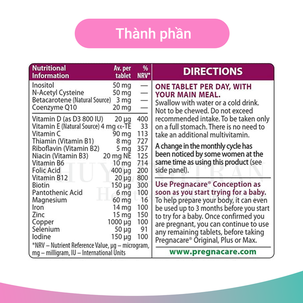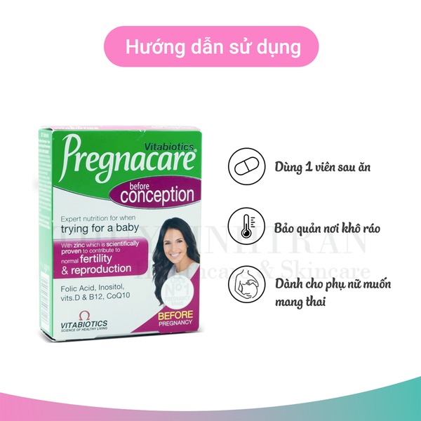 Pregnacare Before Conception là công thức hoàn chỉnh được vương quốc Anh khuyến nghị bổ sung cho phụ nữ đang có ý định mang thai, bổ sung 21 vitamin khoáng chất cần thiết để tăng khả năng sinh sản, hỗ trợ sức khỏe cho mẹ, phòng ngừa dị tật bẩm sinh cho bé, ngừa thiếu máu, suy nhược, …