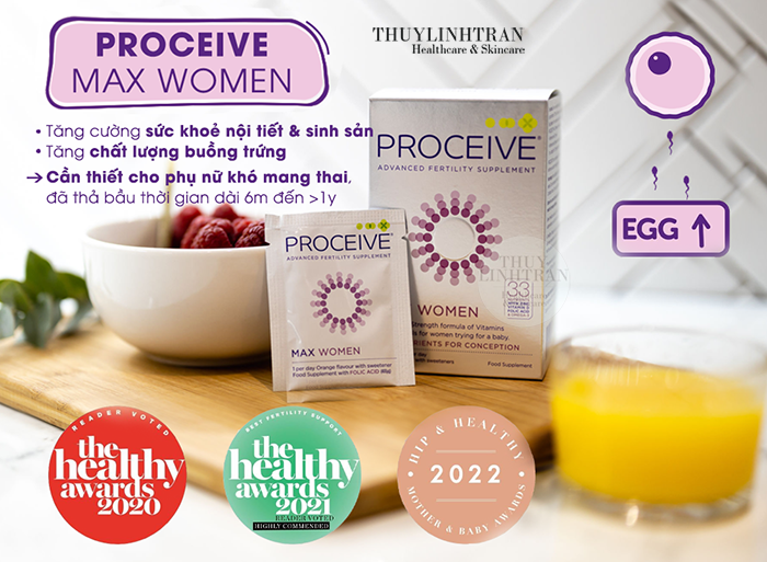 - Proceive Max Women sẽ tạo ra một sự chuẩn bị dinh dưỡng và một môi trường lý tưởng cùng hệ thống nội tiết tố ổn định để cơ thể sẵn sàng cho việc mang thai bởi có chứa 33 loại vitamin và khoáng chất dành cho phụ nữ trên 35 tuổi hoặc trên 18 tuổi đang cố gắng và chưa thể có con từ 12 tháng thả bầu trở lên.